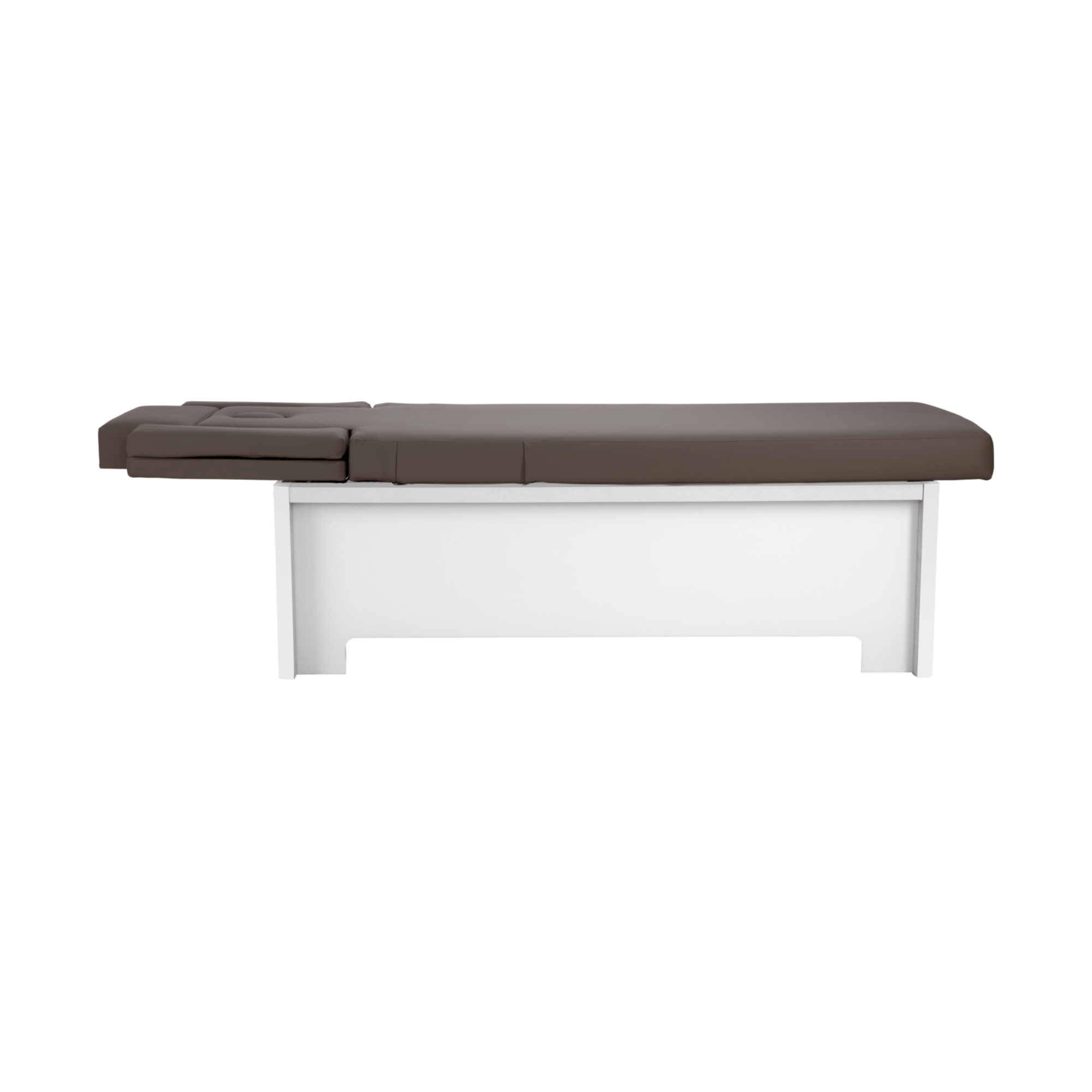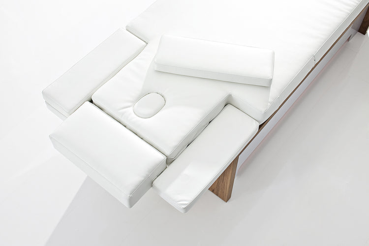 La table de soins est disponible dans les couleurs de tapisserie d'ameublement blanc et moka aussi bien que trois finitions en bois : noyer naturelle, noyer terra et type béton.